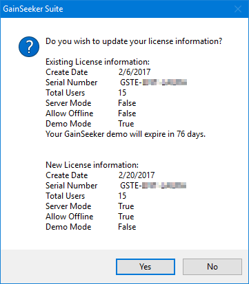 After the license file is imported, GainSeeker will display the details of your license and serial number: