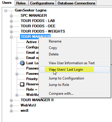 Alternately, you can view a list of the last login information for all users at the same time. To view this information, right-click on any user name node and select View Users' Last Login.