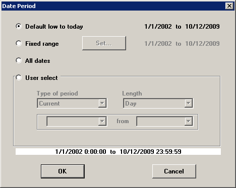 In most cases, it is preferable to choose a relative date range such as Default low to today, All dates or one of the User select options. Most of these options will adjust the actual dates used to retrieve data, based on the date when the user is retrieving data for the chart, report or dashboard. By contrast, if you set a Fixed range as the default date period, the exact dates you specify will be applied to the data being retrieved, regardless of the date when the user is retrieving the data.