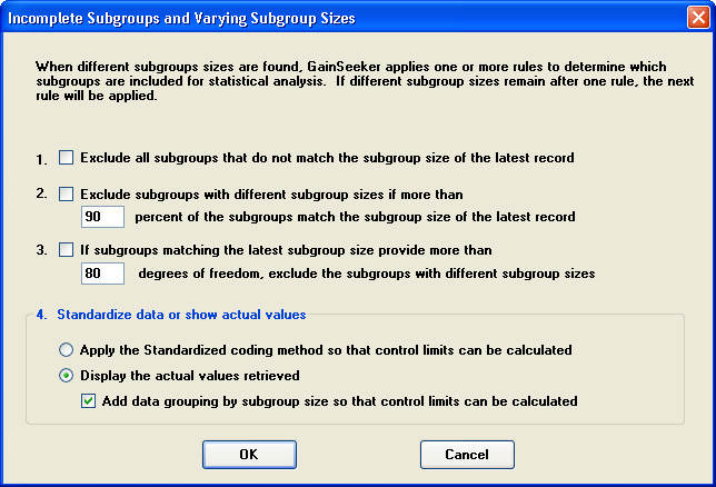 Each time you retrieve data for a standard, GainSeeker will count the number of measurements stored for each subgroup in the retrieval. If you retrieved data with incomplete subgroups or multiple subgroup sizes, the number of measurements per subgroup will not be identical for all subgroups in the retrieval, and GainSeeker will use the settings on this screen to determine how statistics will be calculated on this data:
