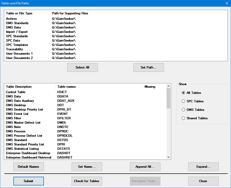 Click Check for Tables to verify that the tables and file paths exist and that the necessary files exist in the specified paths.
