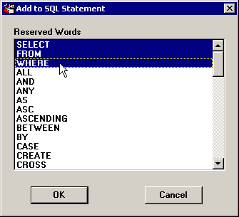 To paste one or more Reserved Words into your SQL statement, select one or more items on this list and then click OK.