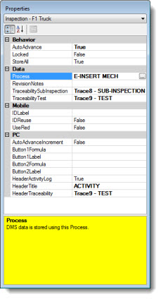 The properties grid is divided into two columns. The left column contains properties (and any subproperties) that are specific to any inspection item. The right column contains setting options for the properties listed adjacent to each.