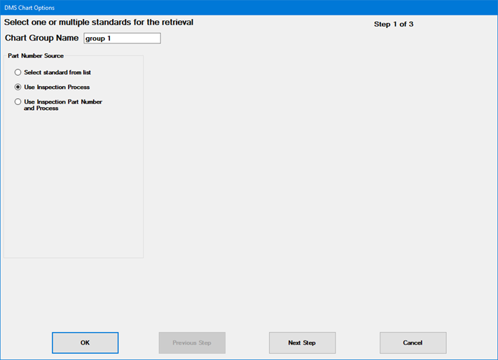 If you want this sub-inspection to chart multiple standards with the same chart types and chart settings (date period, filter, statistical settings, etc.), you can use this step to select all those standards at once – beginning with the Part Number Source: