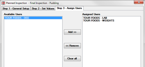 To allow all Available Users to access this Planned Inspection, do not assign any users. To remove any users that have been assigned, click Clear all.