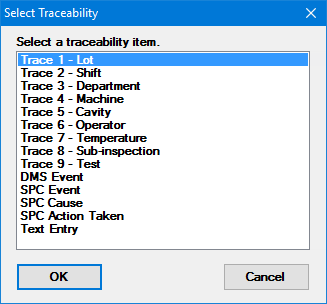 The Traceability test allows you to store values in the following fields of submitted sub-inspection data: Traceability fields, DMS Event, SPC Event, SPC Cause, or SPC Action Taken.