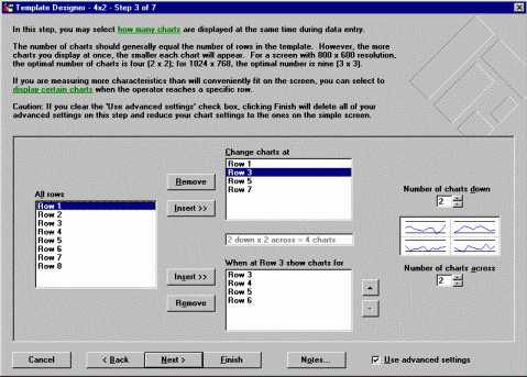 You may want to set different numbers of charts to be displayed at different rows if you want to chart certain characteristics at the same time. Take the example of a template with 7 rows, when the screen looks best with 4 or fewer charts. In this case, you could change charts at row 1 to display 2 charts across and 2 charts down, and then change charts at row 4 to display 3 charts across and 1 down.