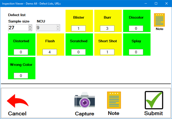 Click a defect button to add 1 to the count for that defect by 1, or right-click the defect button to subtract 1 from its count.