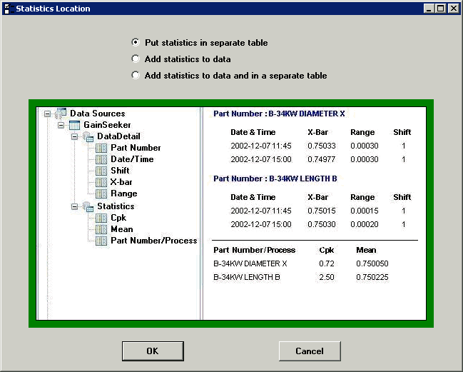 If you select the Pareto detail check box, GainSeeker will provide an additional dataset that you can use to report information for each pareto bar (based on the settings for the report). The results of this dataset are similar to the Pareto Detail report for Pareto charts in the GainSeeker Charts module.