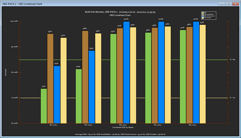 OEE (Overall Equipment Effectiveness) Combined charts display percentage data for Availability, Performance, Quality and overall OEE. The data is grouped and plotted by a selected time period at a single data point at successive time intervals. The OEE Combined chart uses a different color for each of these statistics and different data marker shapes.