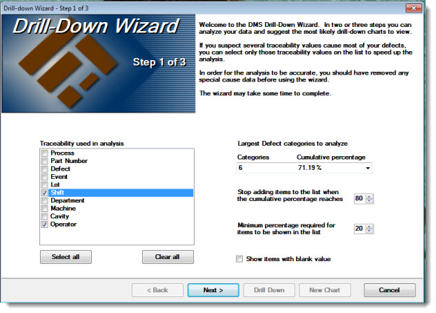 Use the GainSeeker Drill-Down Wizard to discover the most likely items on which to drill into on a Pareto chart to discover the root causes of variation in your processes.
