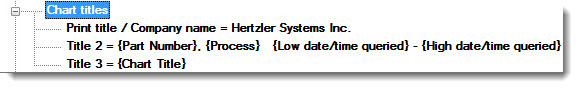 The following examples show the settings for the three title lines and as the settings might display on the chart: