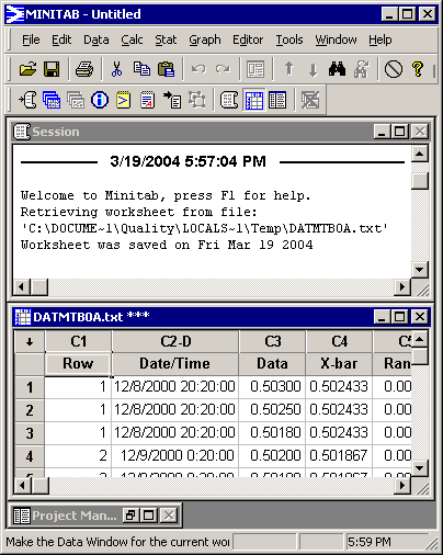 GainSeeker creates a tab-delimited text file of the information appearing in your GainSeeker table, and then it launches MINITAB with commands to automatically open the text file. The result in MINITAB will look something like this: