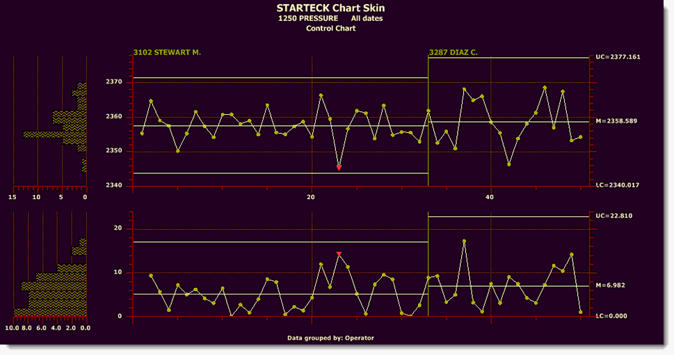 This Control chart has additionally been set to have the data grouped by Operator. The Group data on control and CuSum charts setting (data is grouped by Operator in this example) is a Retrieval/Configuration node setting on the Settings tab that is not saved with the chart skin.