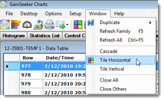 Use the Tile function to rearrange two or more charts or dashboards on the GainSeeker Charts window so they do not overlap. This allows for optimized viewing of each.