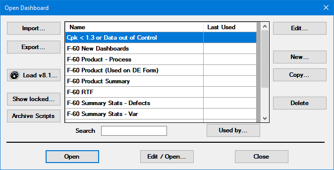 The Open Dashboard dialog serves as the springboard for designing GainSeeker Charts dashboards and for opening previously saved dashboards. Dashboards from the Enterprise Dashboard module (version 8.1 and earlier) can be easily imported to the GainSeeker Charts module.