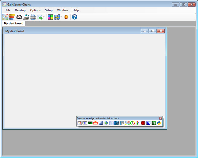 The following example shows a blank dashboard window open in design/edit mode on the GainSeeker Charts window. The dashboard controls toolbar is docked at the bottom of the dashboard window. Using the toolbar is one method for adding a new dashboard control to a dashboard window.