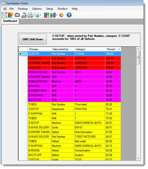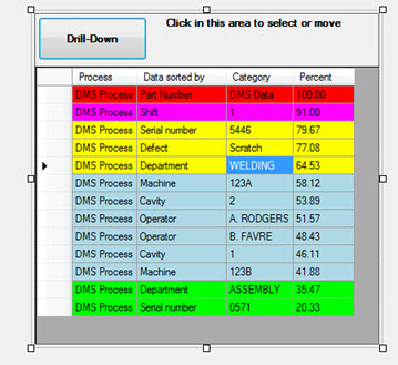 The Big Data Analytics DMS dashboard control can display vast amounts of data. Organize the results using color to help you determine at a glance on which data to focus your efforts. You can also select a row in the grid and then use the DMS Drill-Down button to display a Pareto chart for that data. The chart is sorted by the Data sorted by value for that record. Then you can drill-down into the Pareto bars to see the root causes of defects.