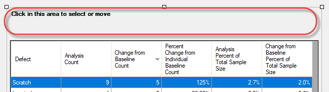 Change from Baseline Percent of Total (Defects/Sample Size) – difference between Analysis percent of total and Baseline percent of total.