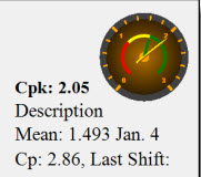 A common use of a fixed target indicator is to point it to an ideal data point such as in the following example, in which the target indicator (white pointer) is fixed at the Cpk 1.67 point. Additional related target indicators could be added to the gage such as one fixed at the ideal Cp point and another fixed at the ideal Cr point.