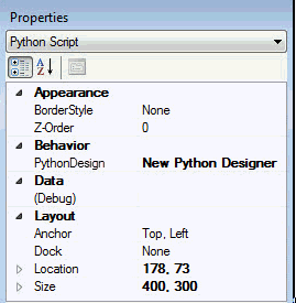 The Python Script Designer opens on the dashboard window. The Properties dialog displays properties specific to the designer as long as the designer is the selected element on the dashboard window. See Python Script Designer Properties below in this topic.