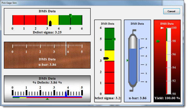 Choose one of six ready-to-use skins to monitor key process indicators along with multiple statistics and user-selected text on a Bar Gage dashboard control. Optionally use color recognition to define acceptable, unacceptable, and cautionary data zones on the gage.
