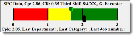 Using this scenario, the Bar Gage region colors of red, yellow, and green may look similar to this on a gage displaying Cpk data.