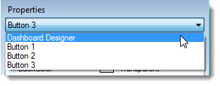 Any dashboard control that is assigned to a dashboard will list in the drop-down list of the Properties window. In the following example, the featured dashboard has seven controls associated with it. Clicking on a dashboard control name in this menu (the Button, for example) is one way to display the property settings specific to that control.