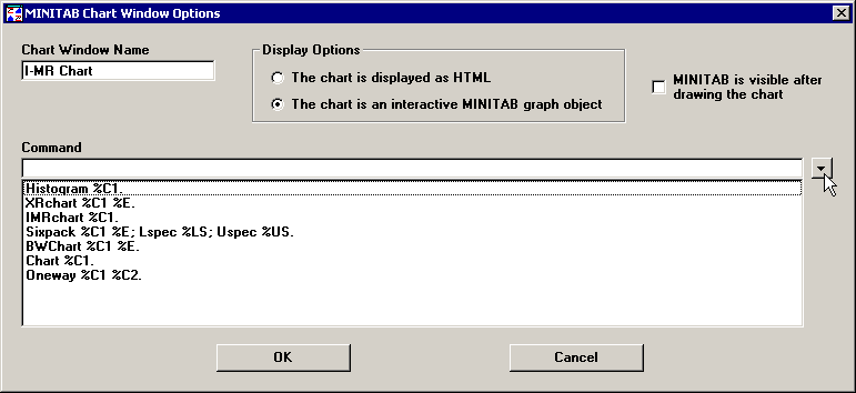 In the Command box, you must specify which MINITAB commands will be executed to generate this chart. There are two ways to enter a command string: