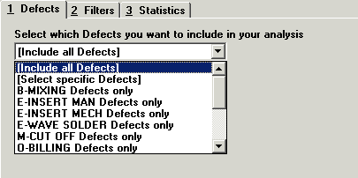 If you want to select specific defects to analyze, click the down arrow beside Include all Defects. You will see these choices from the drop-down menu: