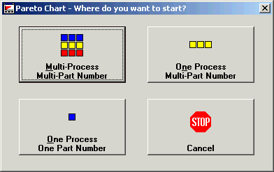 For Pareto and DPU charts, if you want to examine one process in depth, choose One Process, Multi-Part Number. (The resulting chart will have all data on one chart.)