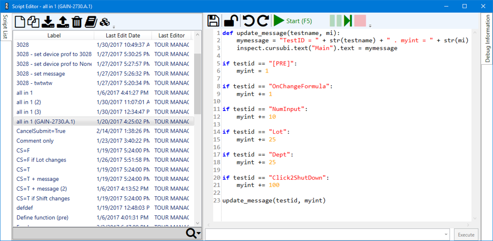 The Python Script Editor is used to edit, debug, and manage your GainSeeker Python scripts. (The exceptions are custom statistics and Device Profiles, which use a different editor.)