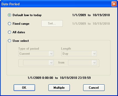 To set a single date period for analysis, choose Default low to today, Fixed range, All dates or User select.