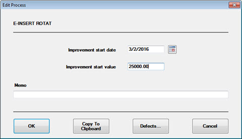 The first two items—Improvement curve start date and Improvement curve start value (DPM)—establish the starting date and DPM (defects per million) value for displaying the 10x improvement curve on DPU charts. You can leave these fields blank, but you cannot draw an improvement curve on your DPU charts if these fields do not contain values. The optional Memo field is useful for recording a short note about the process.