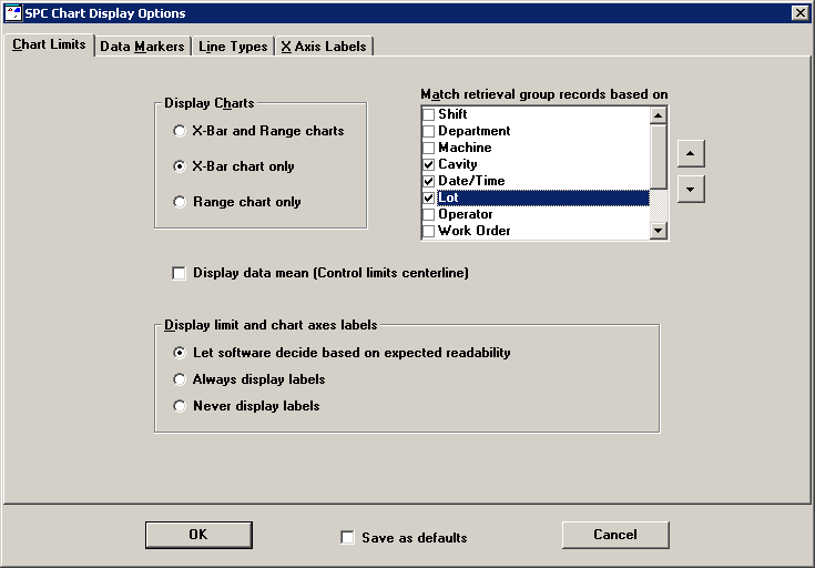 You can decide whether to display X-bar and Range charts, only X-bar charts (the default), or only Range charts. If a standard is configured for Moving Range or Sigma charts, that chart will be substituted for the Range chart.