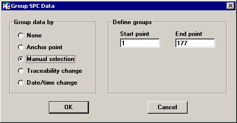 For example, if you want for the first data group to contain the first 25 subgroups of data, type 25 in the End point box. The program automatically defines a second data group for the remainder of the data.