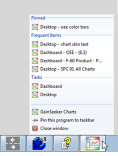 Now you can use the Windows Jump List feature with GainSeeker to gain quick access from your workstation's taskbar to desktops, dashboards, and reports you have recently used. This feature is available for the GainSeeker Charts module (dashboards and desktops) and the Dynamic Reports module.