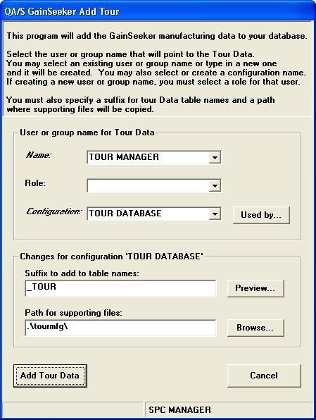 If these table names do not yet exist in your GainSeeker database, the Add Tour program will create them for you and fill them with all of the sample data records.