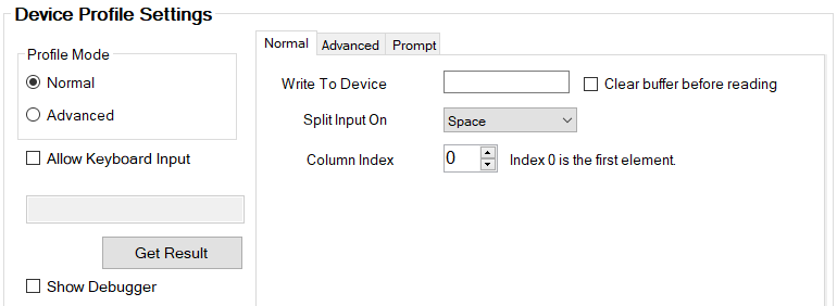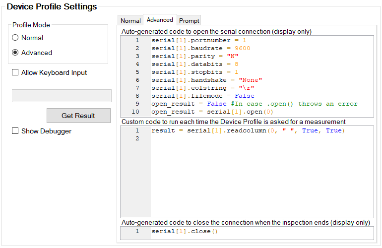 With Profile Mode set to Normal, you can easily configure additional settings for reading RS-232 input strings, writing output strings, extracting your data value from the input string, and prompting the inspector for readings.