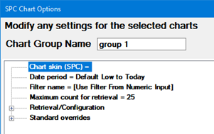 The SPC Chart Options window lets you configure charts to display on the current sub-inspection. For information on opening this window, see Setting charts to display in inspections.