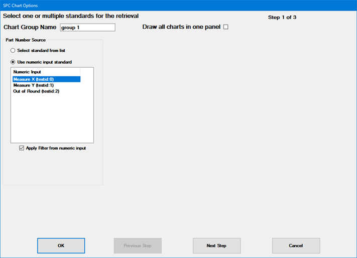 If you want this sub-inspection to chart multiple standards with the same chart types and chart settings, you can use this step to select all those standards at once – beginning with the Part Number Source: