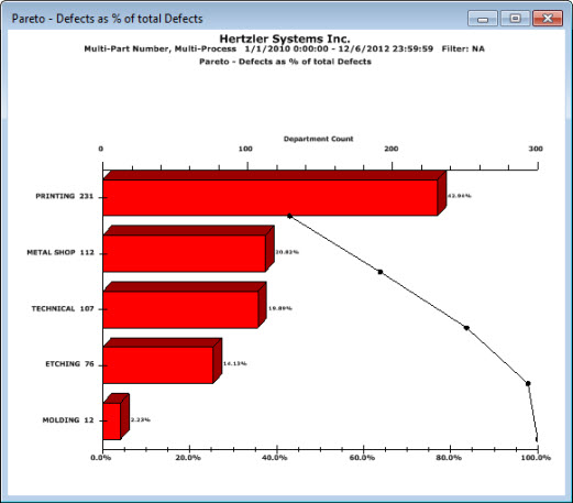 If you opt to drill-down into the listed Existing conditions (Shift 1 in this example) by Department, the following chart would display, which shows most of the defects in Shift 1 occurring in the Printing department.
