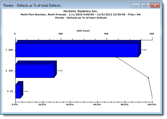 The results are sorted by the highest percentage of defects for each traceability and category. You will usually want to select items with the highest percentage for further analysis. In some cases, the results may be expected, so they can be ignored. An example of this would be when 50% of the results are from Shift 1 and 50% from Shift 2 when you are analyzing only two shifts.