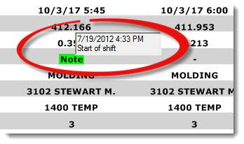 Display multiple statistics and traceability values on a grid above a chart, including one-click, info-tips for Notes at individual data points as shown in this example.