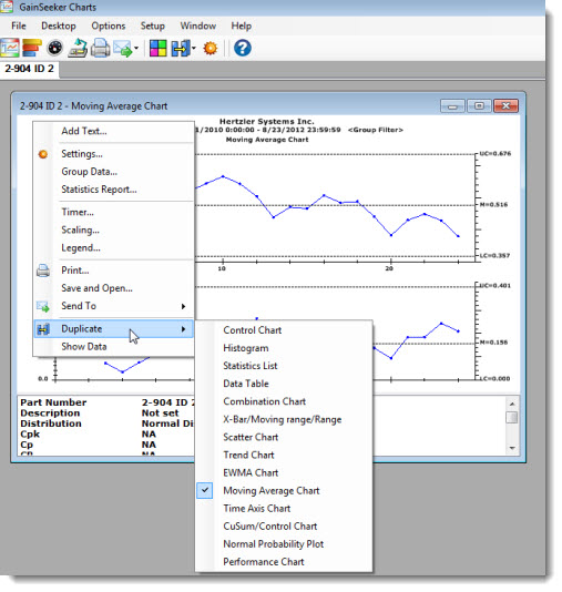 Method 1. Right-click on the chart to display the right-click menu, and then point to Duplicate to display the list of available chart options. Click a chart type to select it. Any existing chart types you already have open with the same data, display on the list with a selected checkbox.