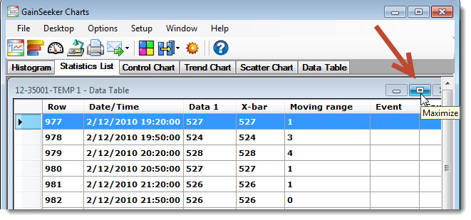 You can maximize the size of all of the open chart and dashboard windows. When a chart or dashboard window is maximized, it fills the GainSeeker Charts window. Maximizing one chart or dashboard window maximizes all other windows that are also open at that time on the GainSeeker Charts window. Additionally, any new windows you add while in maximized mode will be maximized on the GainSeeker Charts window (until you exit the GainSeeker module and reopen it. When you reopen the module, the windows return to the default normal size window mode).