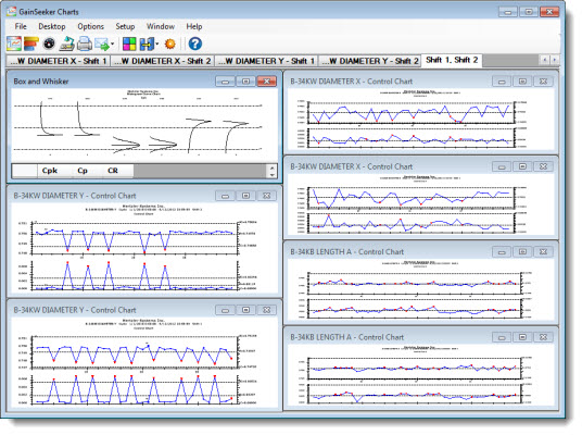 Any time you have charts or dashboards open on the GainSeeker Charts window, an identification tab corresponding to each chart or dashboard displays. One of the tabs will be highlighted, which visually separates it from the others (and selects that chart or dashboard). In the following example, a tab for a Control Chart is highlighted indicating that chart is selected.