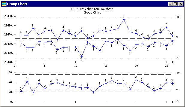 This tool uses one control chart to compare similar subprocesses that are running simultaneously. For example, the chart below compares data from four cavities on one machine. The X-Bar chart plots the low subgroup average and the high subgroup average at each common date/time stamp. The Range chart plots the subgroup range for the part number with the most variability. The Group Chart ignores all other subgroup averages and ranges.