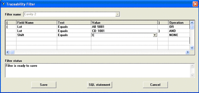 Parenthesis choices allows you to include them as you build the filter criteria. They are especially helpful when you write filters that may use a combination of AND & OR operations. For example, if you want to retrieve data from Lot numbers AB 5001 and CD 1001 but only from first shift you would build the filter as illustrated below.