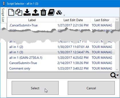 If you are currently editing the Formula test in an Inspection, a Python Dashboard Control in a Dashboard, or a Scripted DMS or Scripted SPC Retrieval in Dynamic Reports 2, you must also click the Select button (below the script names) to choose the selected script for the inspection test, dashboard control, or dynamic report.